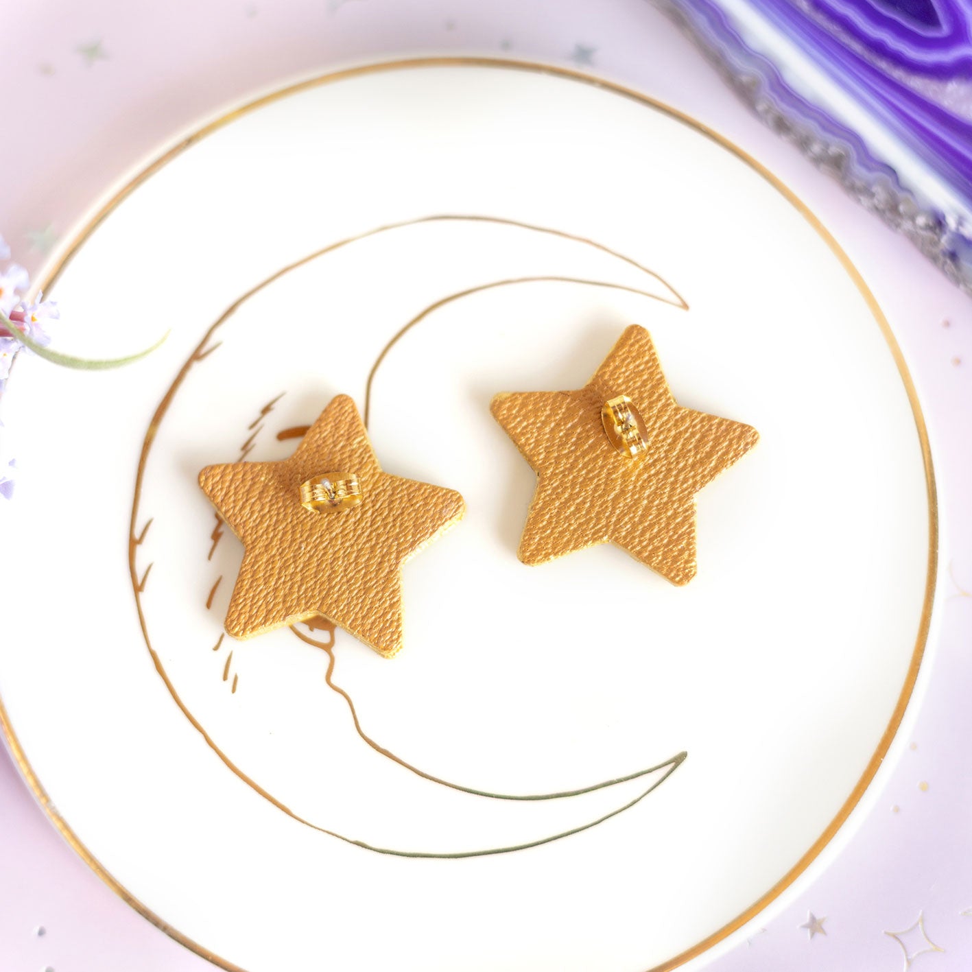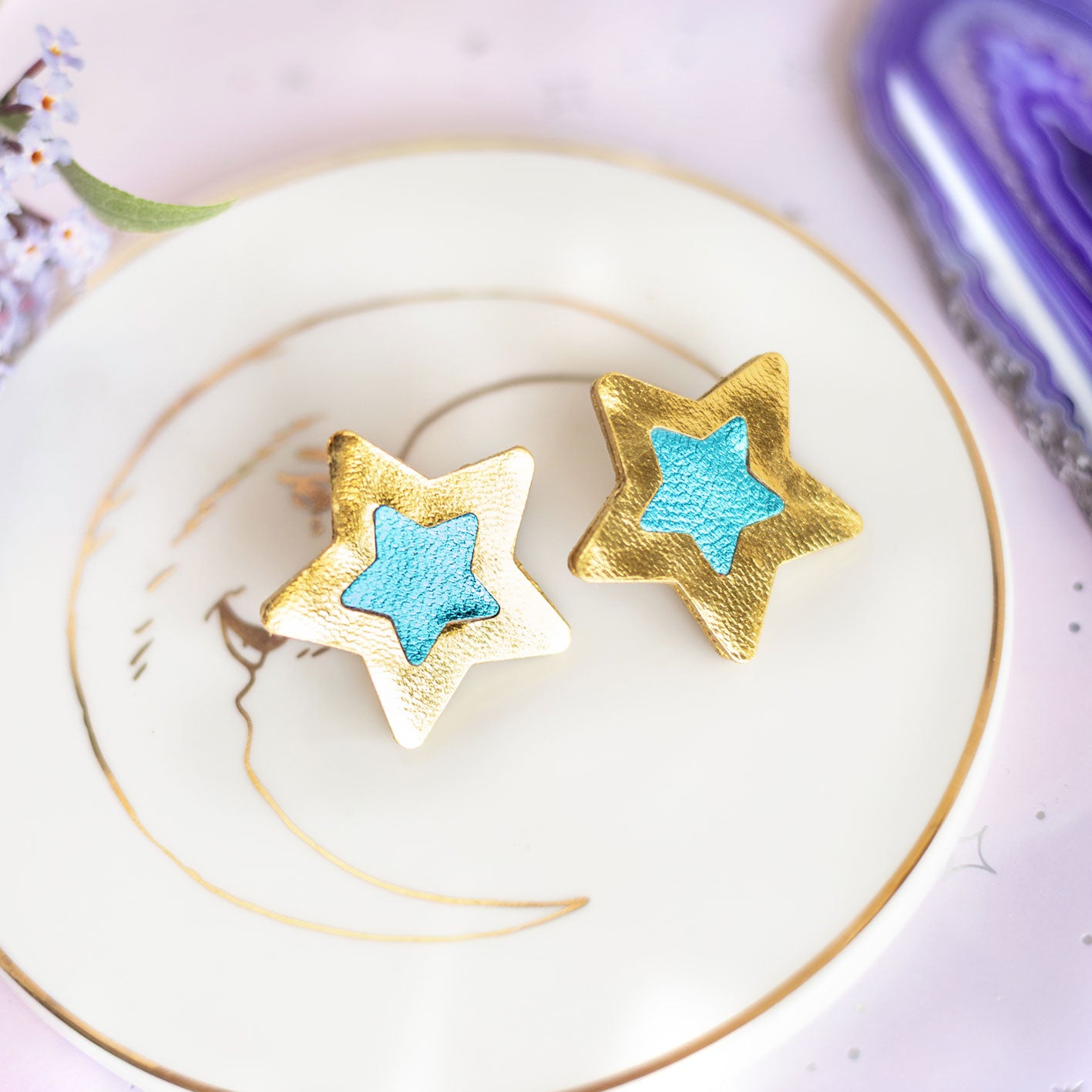 Boucles d'oreilles puces Étoiles - cuir doré et bleu