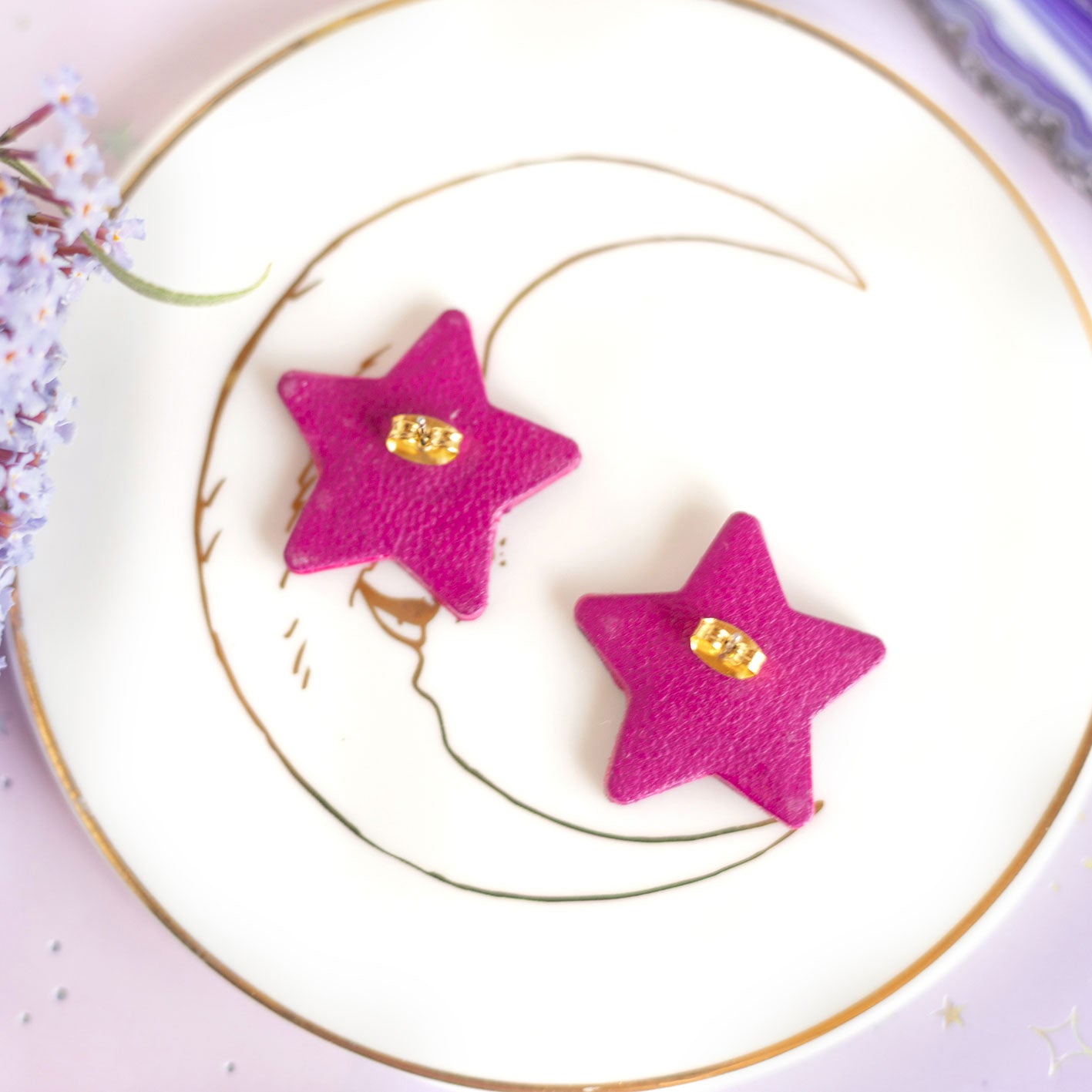 Boucles d'oreilles puces Étoiles - cuir fuchsia et bleu