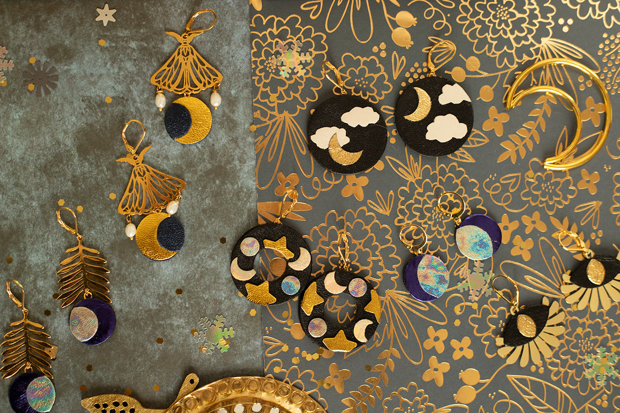 Réalisées à partir de chutes de cuir bleu nuit pailleté et doré.