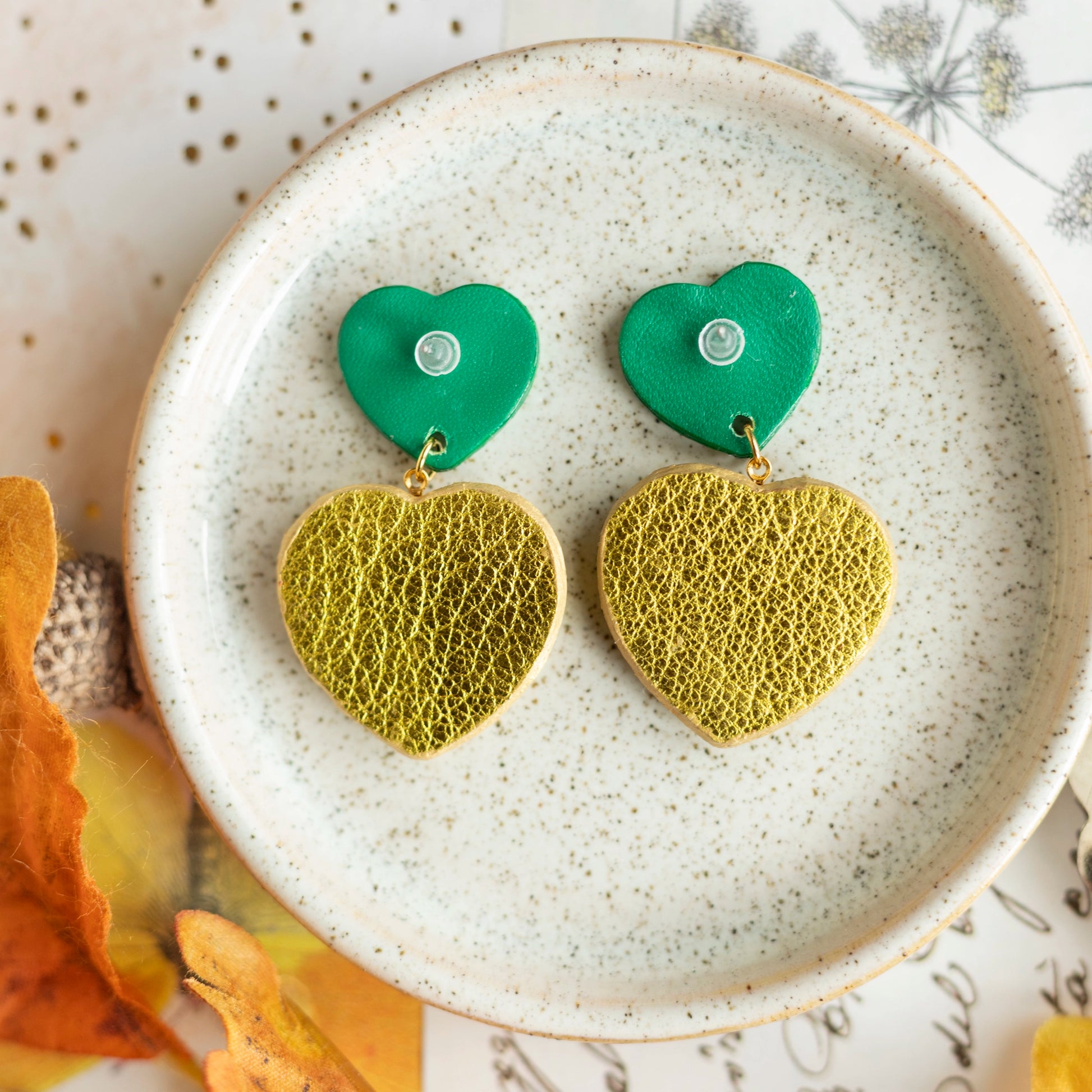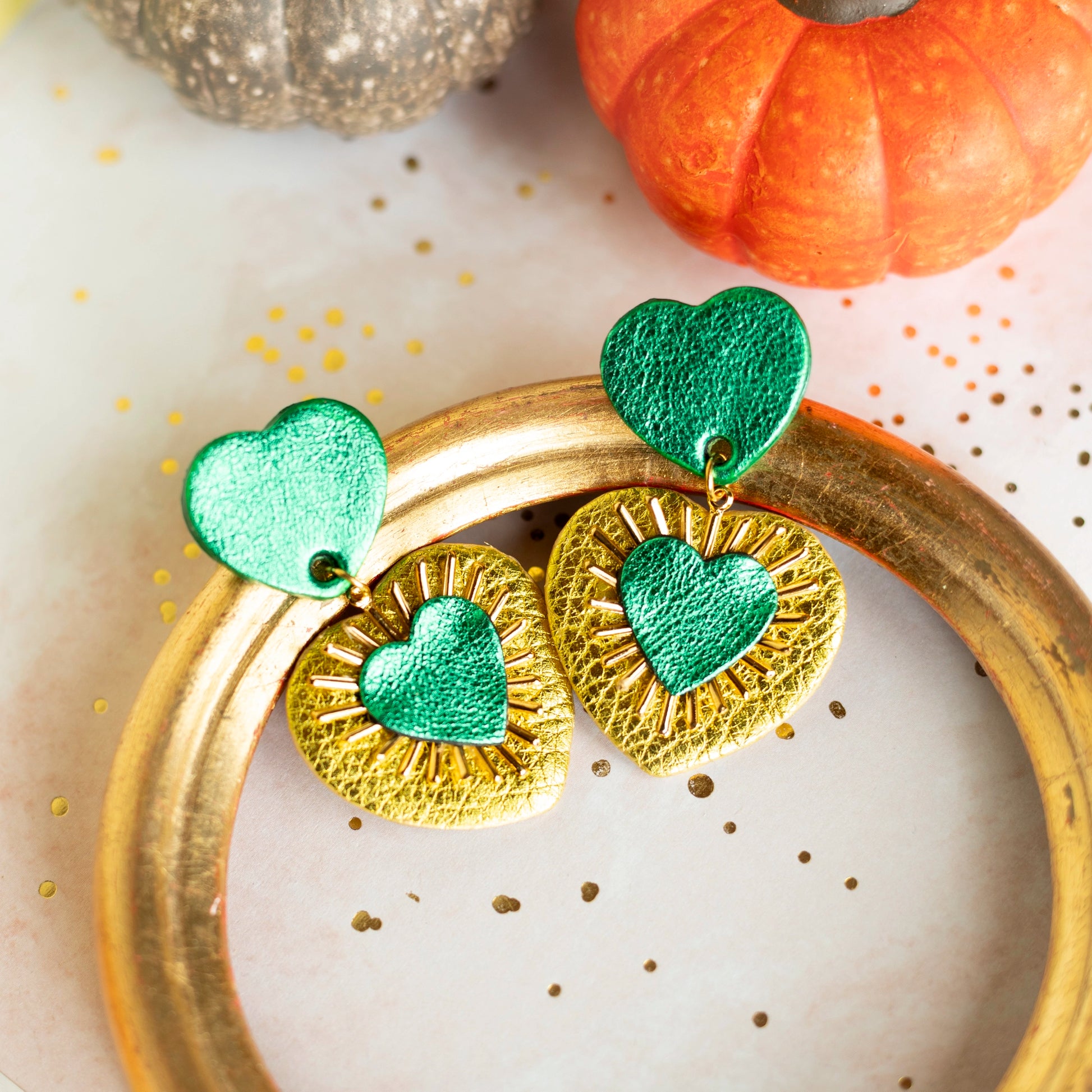 Boucles d'oreilles Coeurs Ex Voto cuirs métallisés vert et chartreuse