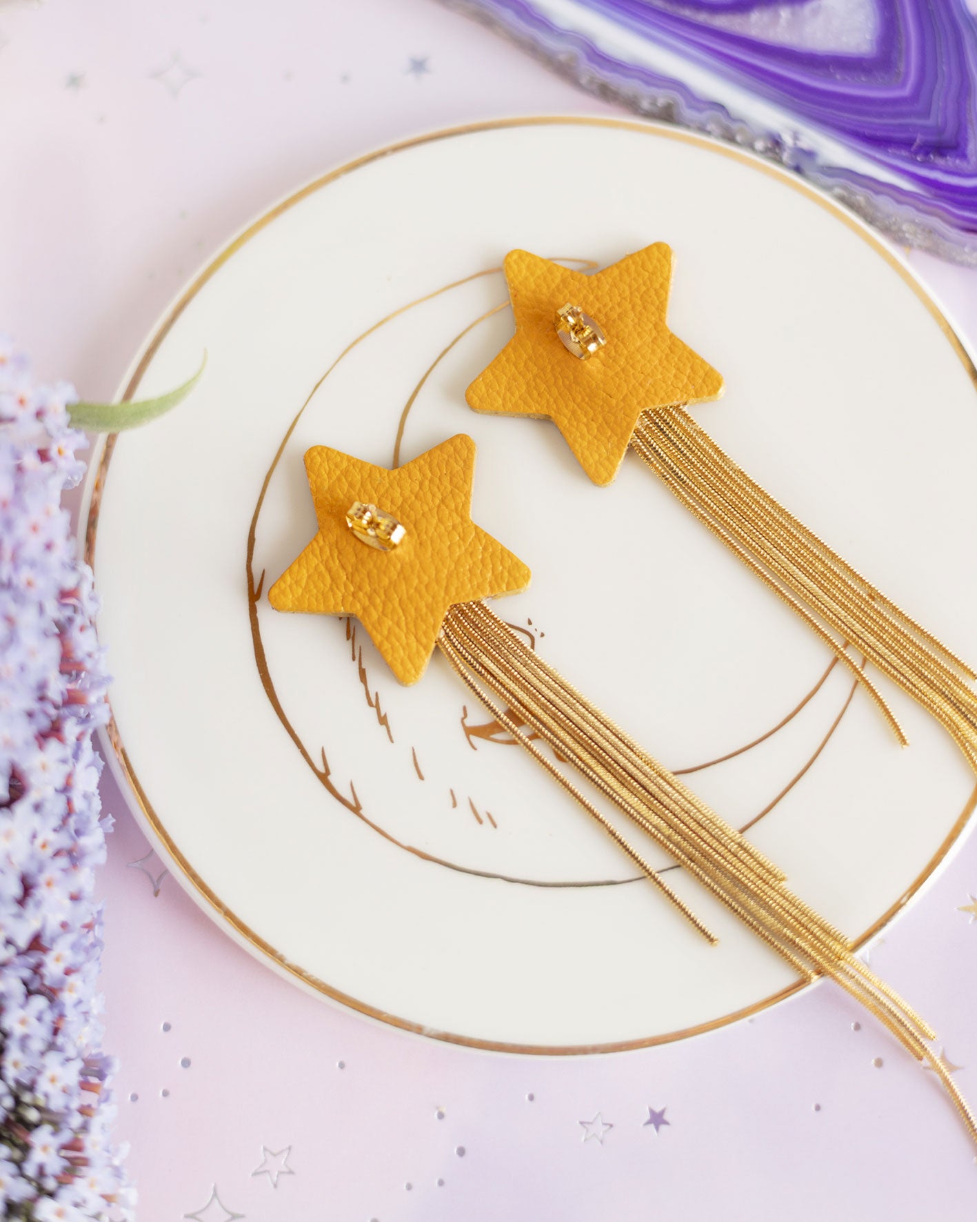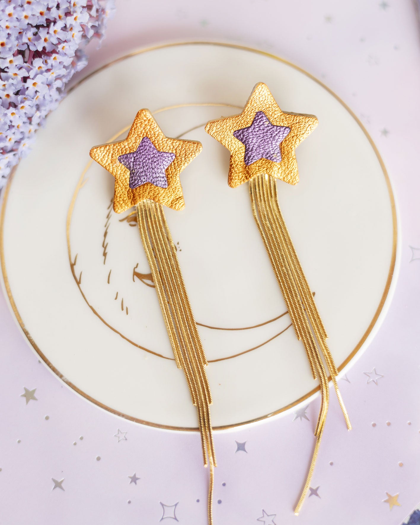 🇬🇧 These ultra-light Comets earrings are made with orange metallic and purple recycled leather. Featuring delicate gold chain fringes, these earrings are carefully crafted in France with the use of high-quality stainless steel and a hand-painted finish for a flawless appearance. They measure 10 cm in length (star + fringes) and 3 cm in width, making them lightweight and perfect for everyday wear.