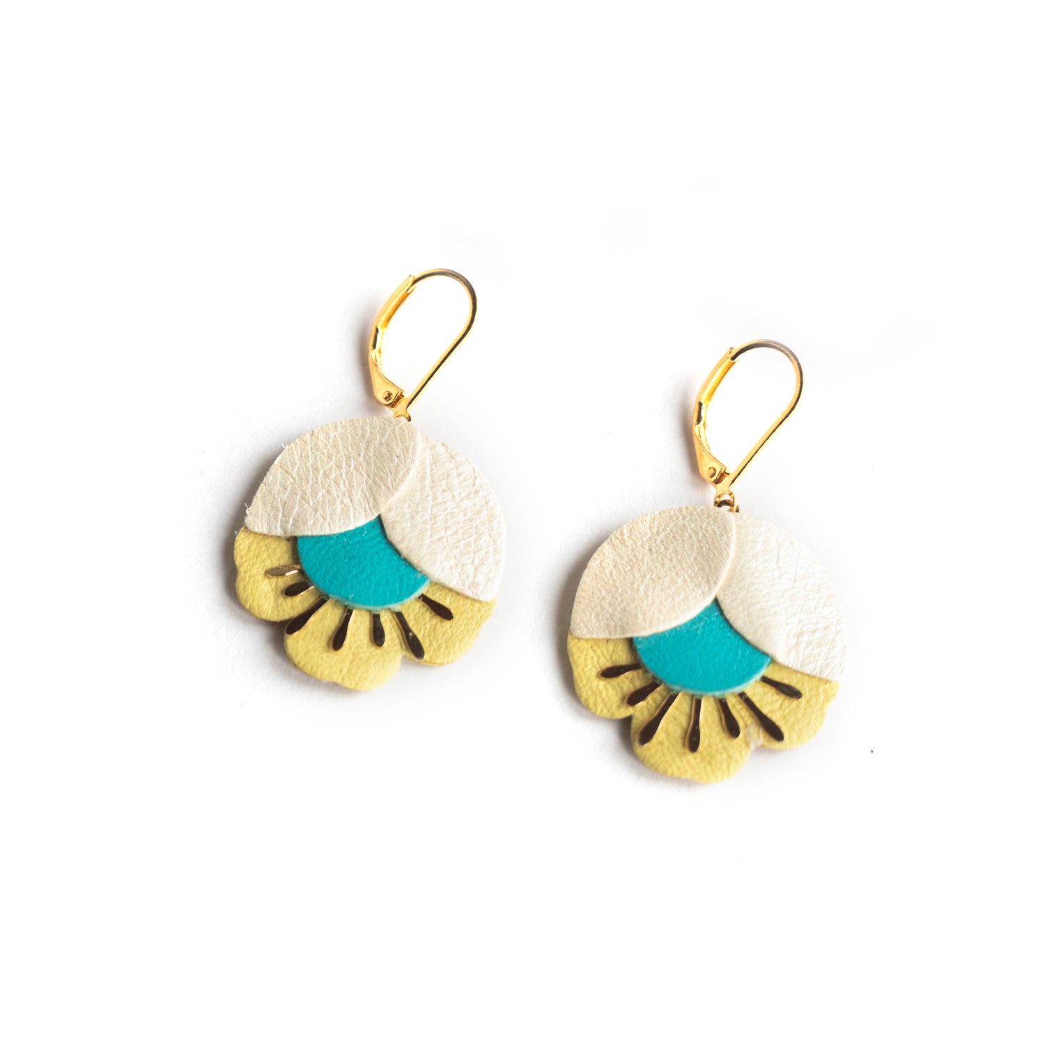 Boucles d'oreilles Fleur de Cerisier cuir blanc, bleu vif, jaune