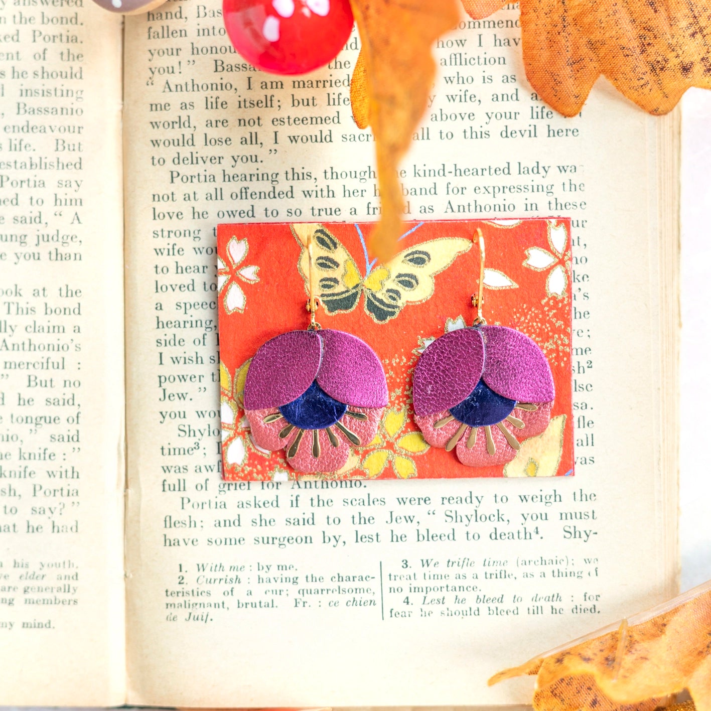 Boucles d'oreilles Fleur de Cerisier cuir framboise, bleu métallisé, cuivre