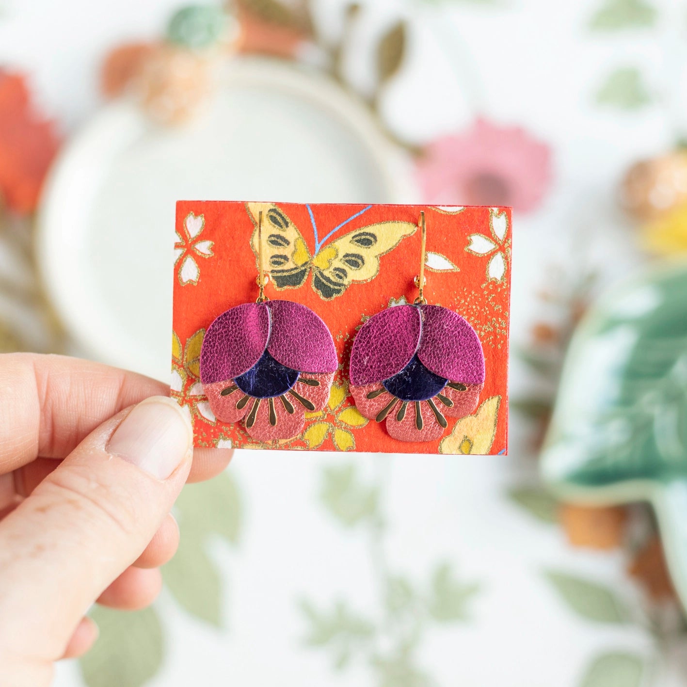 Boucles d'oreilles motif fleur de cerisier dans les couleurs framboise métallisé, bleu outremer métallisé, rouge cuivré.