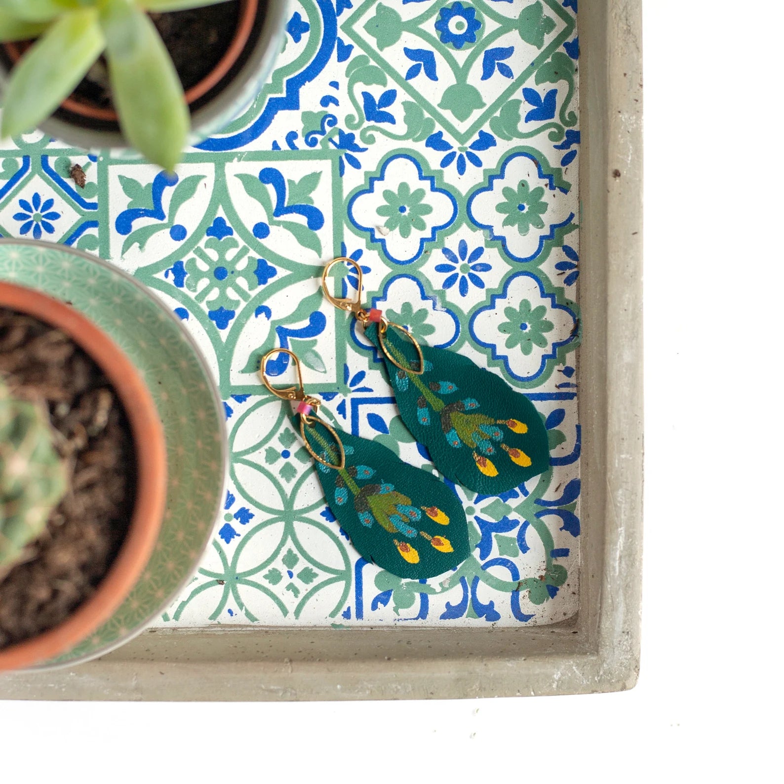Découvrez ces élégantes boucles d'oreilles en cuir vert sapin, inspirées par le vert profond des forêts tropicales.