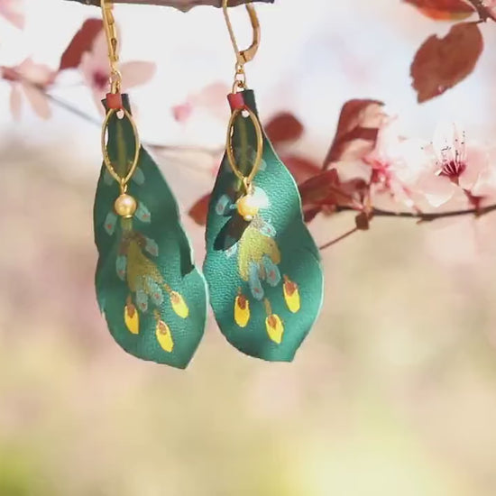 Boucles d'oreilles plumes cuir vert peintes à la main "Le Fantôme de la Forêt"